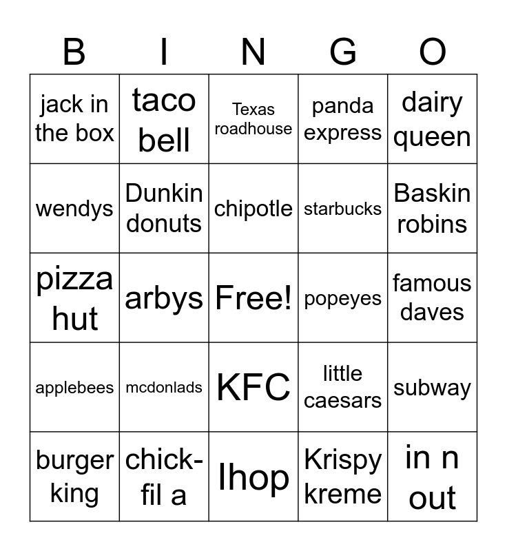 This bingo card has a free space and 24 words: mcdonlads, chick- fil a, chipotle, burger king, dairy queen, jack in the box, wendys, taco bell, popeyes, KFC, starbucks, pizza hut, little caesars, subway, Dunkin donuts, Krispy kreme, famous daves, Texas roadhouse, Baskin robins, arbys, in n out, applebees, panda express and Ihop.