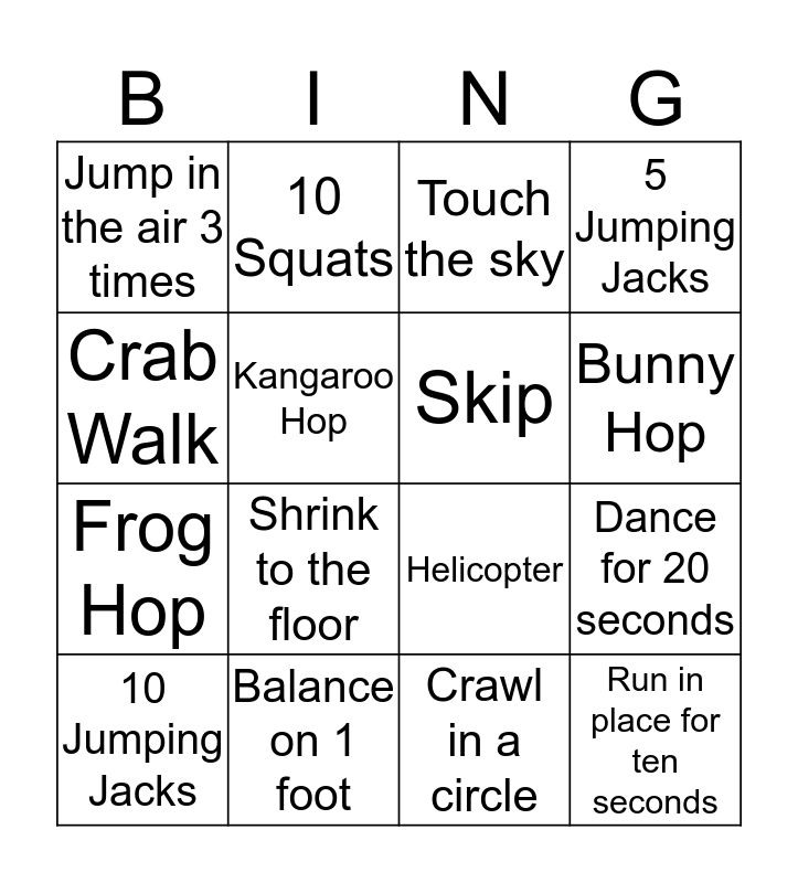 This bingo card has a free space and 15 words: 10 Jumping Jacks, Run in place for ten seconds, Touch the sky, Jump in the air 3 times, Bunny Hop, Crab Walk, Shrink to the floor, Crawl in a circle, Kangaroo Hop, Frog Hop, Dance for 20 seconds, 5 Jumping Jacks, Skip, 10 Squats and Balance on 1 foot.