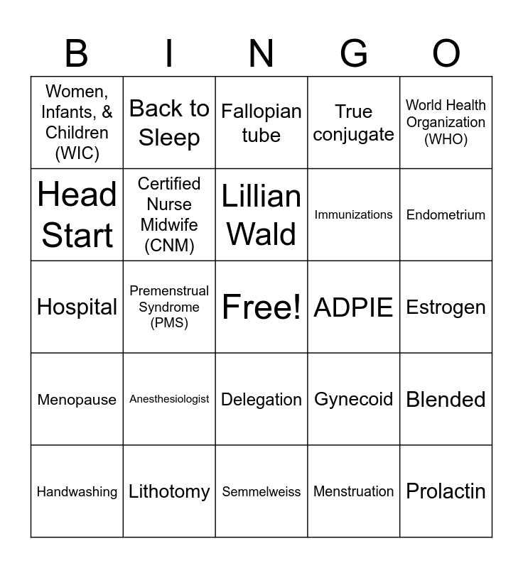 This bingo card has a free space and 25 words: Anesthesiologist, Semmelweiss, Lillian Wald, Handwashing, World Health Organization (WHO), Women, Infants, & Children (WIC), Head Start, Back to Sleep, ADPIE, Delegation, Immunizations, Hospital, Gynecoid, Blended, Certified Nurse Midwife (CNM), Pituitary, Estrogen, Fallopian tube, Endometrium, Premenstrual Syndrome (PMS), Prolactin, Lithotomy, Menopause, True conjugate and Menstruation.