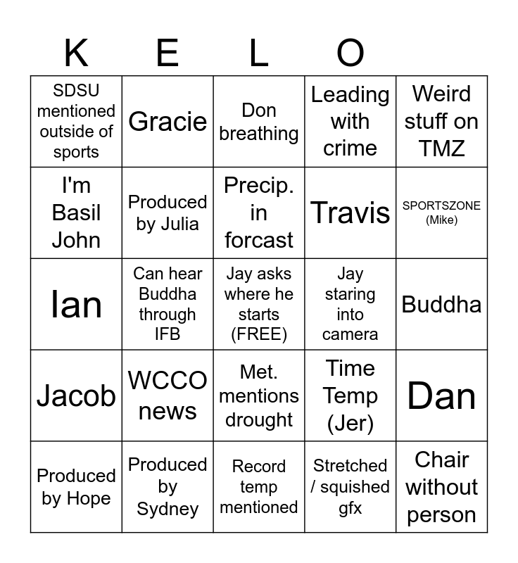 This bingo card has a free space and 88 words: Met. goes long, Met. goes short, Met. mentions drought, Tom, Lauren, Jay, Adam, Scot, Brian, Kelli, Don, Perry, Dan, Buddha, Kevin mentioned, Precip. in forcast, Bad crosstalk, Filler story (PSA), Floated bump, Animal story, 41st street livecam, Grant, Ian, Anya, Stretched / squished gfx, Error in wxgfx, Scandoo, Epic movement, Sports pkg, Jay scares ops, Don breathing, Leading with crime, Heavy sigh, Live shot, WCCO news, I'm Basil John, SDSU mentioned outside of sports, USD mentioned outside of sports, 10/10 name L3, SPORTSZONE (Mike), Can hear Buddha through IFB, NEWS NATION, Price, Price, Price, Time Temp (Jer), Jay staring into camera, Sot not in red, Pickleball mentioned, Summer, Jordan, Travis, Julia, Tyler, Tyler pkg in late, Bad interview framing, Karlee, Bob, Jacob, Gracie, Rae, fELIZ nAVIDAD, Michael Doorn, Produced by Hannah, Produced by Kullyn, Produced by Kyle, Produced by Anna, Produced by Sydney, Produced by Perry, Produced by Julia, Produced by Hope, Chair without person, Weather corner, 4:3 footage, Vertical video, Weird stuff on TMZ, Battery dies, Kevin pkg, Adlibbed transition, Religion, Record temp mentioned, Falls park mentioned, Police breifing, Dusty Johnson, Kristi Noem, Mike Rounds, John Thune, Mayor mentioned, Unexpected Success and Strange Jay noise.