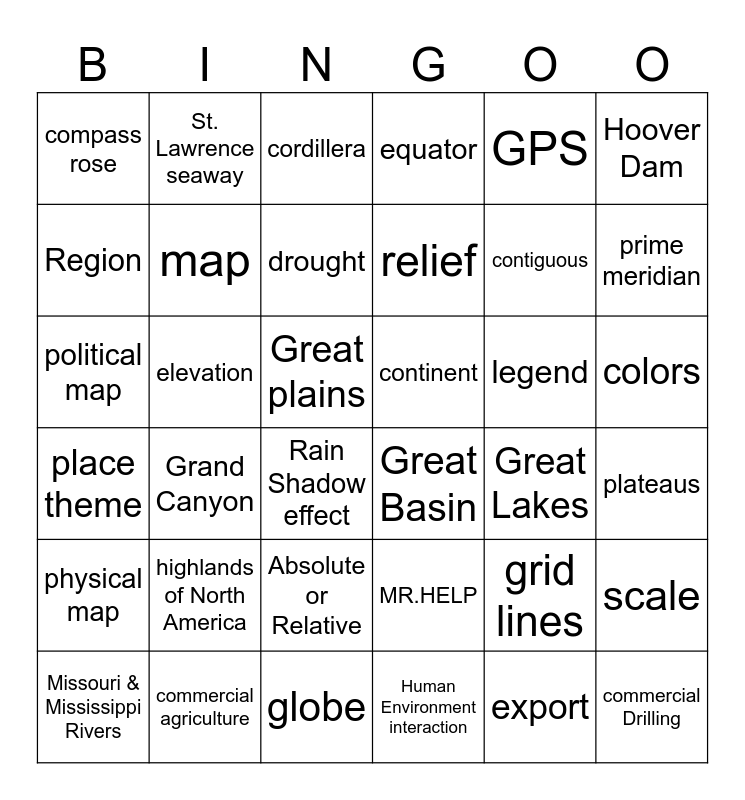 This bingo card has 36 words: MR.HELP, Absolute or Relative, Human Environment interaction, Region, place theme, continent, map, globe, GPS, grid lines, prime meridian, equator, scale, elevation, relief, compass rose, physical map, legend, political map, cordillera, Great plains, Grand Canyon, Great Basin, Rain Shadow effect, Great Lakes, St. Lawrence seaway, contiguous, commercial agriculture, drought, Hoover Dam, commercial Drilling, Missouri & Mississippi Rivers, plateaus, colors, highlands of North America and export.