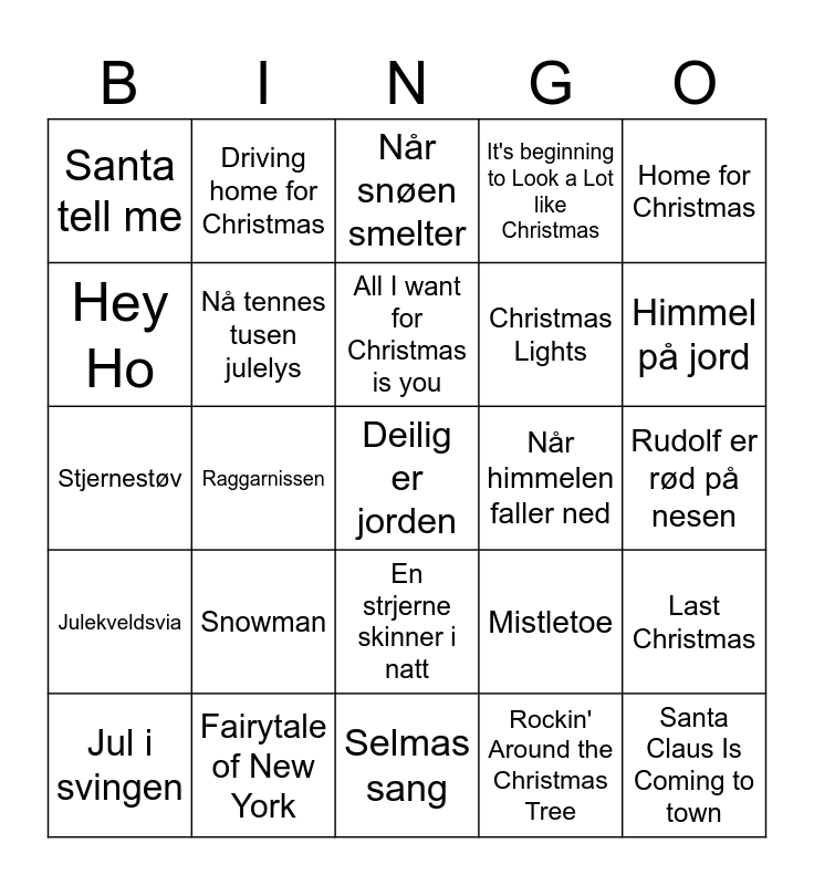 This bingo card has 25 words: Snowman, Selmas sang, All I want for Christmas is you, Jul i svingen, Home for Christmas, Santa tell me, Hey Ho, Driving home for Christmas, Når himmelen faller ned, En strjerne skinner i natt, Christmas Lights, Stjernestøv, Mistletoe, Last Christmas, Nå tennes tusen julelys, Santa Claus Is Coming to town, Rudolf er rød på nesen, Når snøen smelter, Himmel på jord, Raggarnissen, Deilig er jorden, Fairytale of New York, Julekveldsvia, It's beginning to Look a Lot like Christmas and Rockin' Around the Christmas Tree.