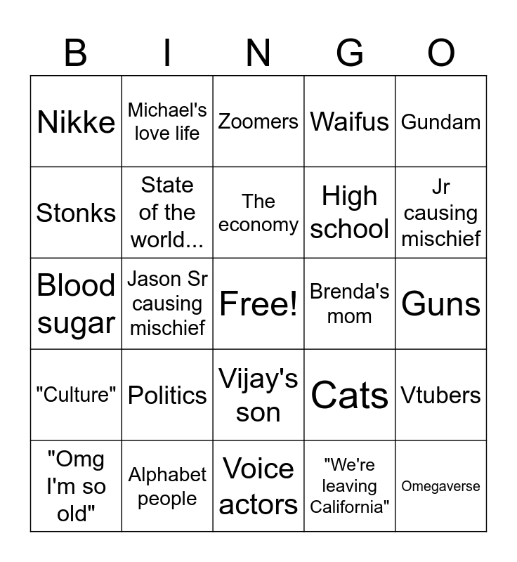 This bingo card has a free space and 24 words: Politics, Alphabet people, The economy, "Omg I'm so old", Gundam, Nikke, Stonks, Michael's love life, Brenda's mom, Vijay's son, High school, Blood sugar, Cats, Vtubers, State of the world..., "We're leaving California", Guns, Zoomers, Jr causing mischief, Jason Sr causing mischief, Omegaverse, "Culture", Waifus and Voice actors.