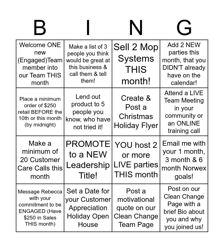 This bingo card has a free space and 15 words: Message Rebecca with your commitment to be ENGAGED (Have $250 in Sales THIS month), Post on our Clean Change Page with a brief Bio about you and why you joined us!, Sell 2 Mop Systems THIS month!, Welcome ONE new (Engaged)Team member into our Team THIS month, Attend a LIVE Team Meeting in your community or an ONLINE training call, Place a minimum order of $250 retail BEFORE the 10th or this month (by midnight), PROMOTE to a NEW Leadership Title!, Post a motivational quote on our Clean Change Team Page, Lend out product to 5 people you know, who have not tried it!, Make a minimum of 20 Customer Care Calls this month, Email me with your 1 month, 3 month & 6 month Norwex goals!, Add 2 NEW parties this month, that you DIDN'T already have on the calendar!, Create & Post a Christmas Holiday Flyer, Make a list of 3 people you think would be great at this business & call them & tell them! and Set a Date for your Customer Appreciation Holiday Open House.