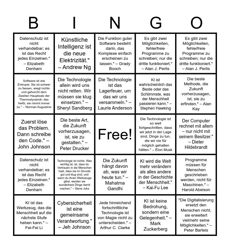 This bingo card has a free space and 24 words: Technologie ist nichts. Was wichtig ist, ist, dass du Vertrauen in die Menschen hast, dass sie im Grunde gut und klug sind, und wenn du ihnen Werkzeuge gibst, werden sie wunderbare Dinge damit machen." – Steve Jobs, Cybersicherheit ist eine gemeinsame Verantwortung." – Jeh Johnson, Die Technologie ist das Lagerfeuer, um das wir uns versammeln." – Laurie Anderson, KI ist das Werkzeug, das die Menschheit auf die nächste Stufe heben kann." – Fei-Fei Li, Es gibt zwei Möglichkeiten, fehlerfreie Programme zu schreiben; nur die dritte funktioniert." – Alan J. Perlis, Datenschutz ist nicht verhandelbar; es ist das Recht jedes Einzelnen." – Elizabeth Denham, Software ist wie Entropie: Sie ist schwer zu fassen, wiegt nichts und gehorcht dem Zweiten Hauptsatz der Thermodynamik; das heißt, sie nimmt immer zu." – Norman Augustine, Künstliche Intelligenz ist die neue Elektrizität." – Andrew Ng, Die Technologie ist so weit fortgeschritten, dass wir jetzt in der Lage sind, Dinge zu tun, die wir nie für möglich gehalten hätten." – Elon Musk, Die Zukunft hängt davon ab, was wir heute tun." – Mahatma Gandhi, KI ist wahrscheinlich das Beste oder das Schlimmste, was der Menschheit passieren kann." – Stephen Hawking, Zuerst löse das Problem. Dann schreibe den Code." – John Johnson, KI wird die Welt mehr verändern als alles andere in der Geschichte der Menschheit." – Kai-Fu Lee, Programme müssen für Menschen geschrieben werden, nicht für Maschinen." – Harold Abelson, Die Technologie allein wird uns nicht retten. Wir müssen sie klug einsetzen." – Sheryl Sandberg, KI ist keine Bedrohung, sondern eine Gelegenheit." – Mark Zuckerberg, Der Computer rechnet mit allem – nur nicht mit seinem Besitzer." – Dieter Hildebrandt, Die Funktion guter Software besteht darin, das Komplexe einfach erscheinen zu lassen." – Grady Booch, Die beste Methode, die Zukunft vorherzusagen, ist, sie zu erfinden." – Alan Kay, Die beste Art, die Zukunft vorherzusagen, ist, sie zu gestalten." – Peter Drucker, "Die Digitalisierung ersetzt den Menschen nicht, sie erweitert vielmehr seine Möglichkeiten." – Peter Bartels, Datenschutz ist nicht verhandelbar; es ist das Recht jedes Einzelnen." – Elizabeth Denham, Es gibt zwei Möglichkeiten, fehlerfreie Programme zu schreiben; nur die dritte funktioniert." – Alan J. Perlis and Jede hinreichend fortschrittliche Technologie ist von Magie nicht zu unterscheiden." – Arthur C. Clarke.