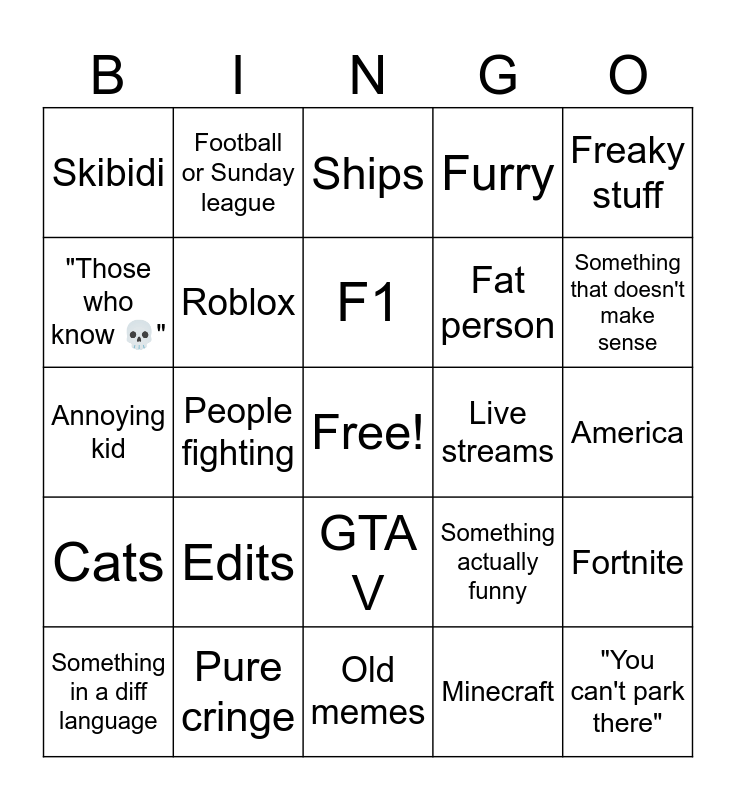 This bingo card has a free space and 24 words: Edits, Pure cringe, F1, Something in a diff language, Freaky stuff, Skibidi, "Those who know 💀", Football or Sunday league, Live streams, GTA V, Fat person, Annoying kid, Something actually funny, Fortnite, Roblox, Minecraft, America, Ships, Something that doesn't make sense, People fighting, "You can't park there", Cats, Furry and Old memes.