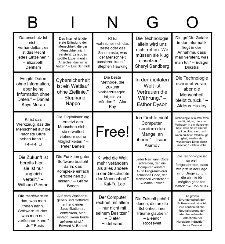 This bingo card has a free space and 24 words: Die Funktion guter Software besteht darin, das Komplexe einfach erscheinen zu lassen." – Grady Booch, Auf dem Wasser zu gehen und Software anhand einer Spezifikation zu entwickeln, sind einfach, wenn beide gefroren sind." – Edward V. Berard, Die beste Methode, die Zukunft vorherzusagen, ist, sie zu erfinden." – Alan Kay, Die Hardware ist das, was man treten kann. Software ist das, was man nur verfluchen kann." – Jeff Pesis, Die größte Gefahr in der Informatik liegt in der Annahme, dass man versteht, was man tut." – Edsger Dijkstra, Datenschutz ist nicht verhandelbar; es ist das Recht jedes Einzelnen." – Elizabeth Denham, Es gibt Daten ohne Information, aber keine Information ohne Daten." – Daniel Keys Moran, Das Internet ist die erste Erfindung der Menschheit, die der Menschheit nicht versteht. Es ist das größte Experiment in Anarchie, das wir je hatten." – Eric Schmidt, Ich fürchte nicht Computer, sondern den Mangel an ihnen." – Isaac Asimov, KI wird die Welt mehr verändern als alles andere in der Geschichte der Menschheit." – Kai-Fu Lee, In der digitalen Welt ist Vertrauen die Währung." – Esther Dyson, KI ist das Werkzeug, das die Menschheit auf die nächste Stufe heben kann." – Fei-Fei Li, Jeder Narr kann Code schreiben, den ein Computer versteht. Gute Programmierer schreiben Code, den Menschen verstehen." – Martin Fowler, Die Technologie ist so weit fortgeschritten, dass wir jetzt in der Lage sind, Dinge zu tun, die wir nie für möglich gehalten hätten." – Elon Musk, Cybersicherheit ist ein Wettlauf ohne Ziellinie." – Stephane Nappo, Die Zukunft gehört denen, die an die Schönheit ihrer Träume glauben." – Eleanor Roosevelt, Technologie ist nichts. Was wichtig ist, ist, dass du Vertrauen in die Menschen hast, dass sie im Grunde gut und klug sind, und wenn du ihnen Werkzeuge gibst, werden sie wunderbare Dinge damit machen." – Steve Jobs, KI ist wahrscheinlich das Beste oder das Schlimmste, was der Menschheit passieren kann." – Stephen Hawking, Die Technologie schreitet voran, aber die Menschheit bleibt zurück." – Aldous Huxley, Die Digitalisierung ersetzt den Menschen nicht, sie erweitert vielmehr seine Möglichkeiten." – Peter Bartels, Die größte Errungenschaft der Software-Industrie ist ihre kontinuierliche Neutralisierung der atemberaubenden Fortschritte der Hardware-Industrie." – Henry Petroski, Die Zukunft ist bereits hier – sie ist nur ungleich verteilt." – William Gibson, Die Technologie allein wird uns nicht retten. Wir müssen sie klug einsetzen." – Sheryl Sandberg and Der Computer rechnet mit allem – nur nicht mit seinem Besitzer." – Dieter Hildebrandt.