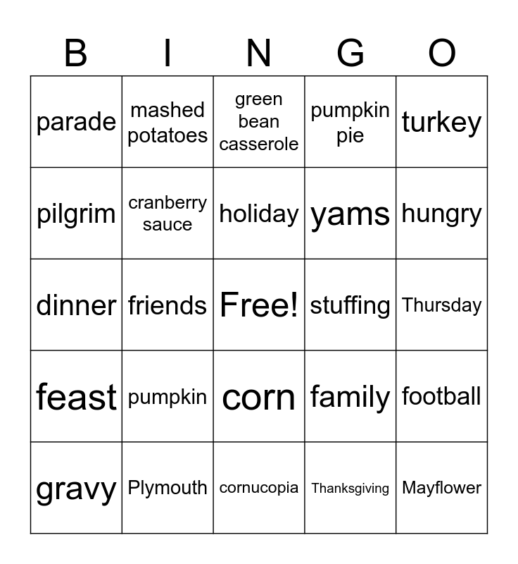 This bingo card has a free space and 24 words: pumpkin, Plymouth, holiday, gravy, turkey, parade, pilgrim, mashed potatoes, stuffing, corn, yams, dinner, family, football, cranberry sauce, Thanksgiving, Thursday, green bean casserole, hungry, friends, Mayflower, feast, pumpkin pie and cornucopia.