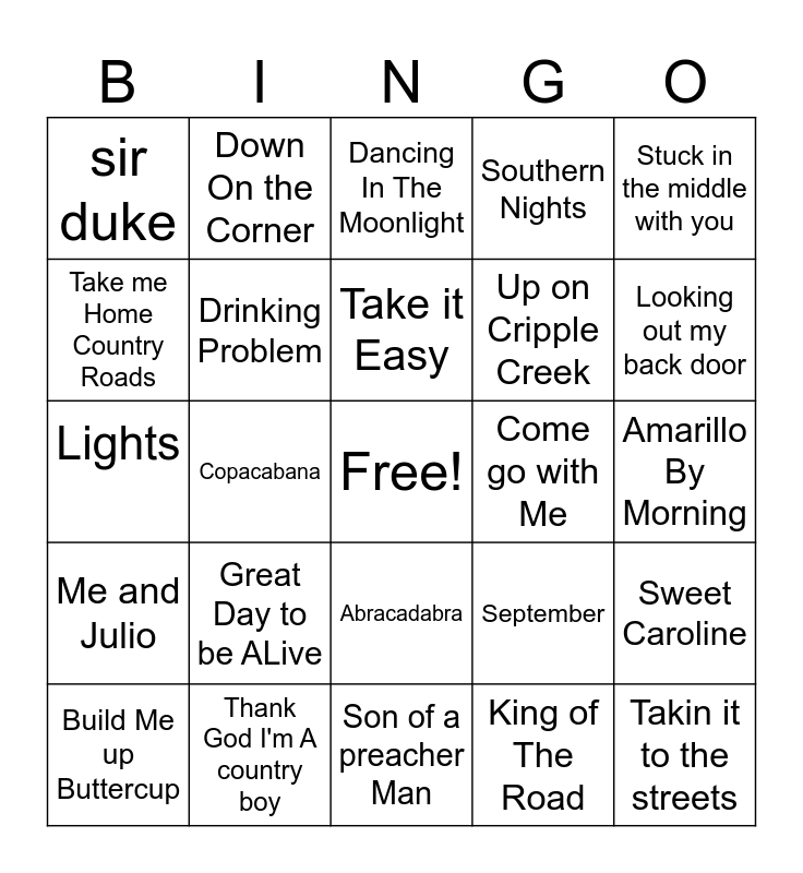 This bingo card has a free space and 24 words: Great Day to be ALive, Thank God I'm A country boy, Take it Easy, Build Me up Buttercup, Stuck in the middle with you, sir duke, Take me Home Country Roads, Down On the Corner, Come go with Me, Abracadabra, Up on Cripple Creek, Lights, September, Sweet Caroline, Drinking Problem, King of The Road, Amarillo By Morning, Dancing In The Moonlight, Looking out my back door, Copacabana, Takin it to the streets, Me and Julio, Southern Nights and Son of a preacher Man.