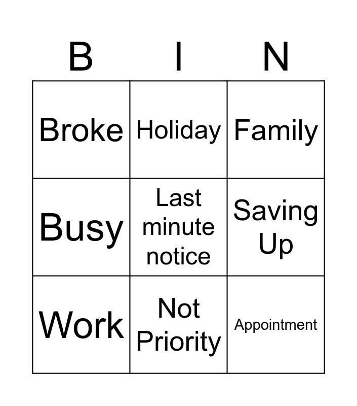This bingo card has a free space and 9 words: Work, Family, Holiday, Busy, Broke, Saving Up, Appointment, Too far and Not Priority.
