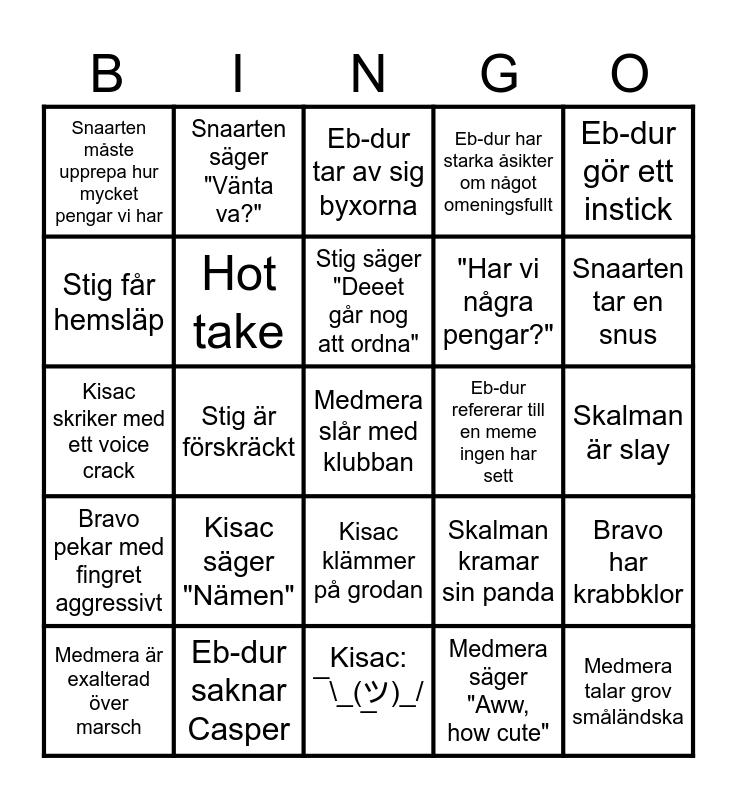 This bingo card has a free space and 45 words: Medmera har händerna i ansiktet, Medmera talar grov småländska, Medmera får ett citat, Medmera är exalterad över marsch, Medmera gestikulerar med händerna, Medmera säger "Aww, how cute", Eb-dur tar av sig byxorna, Eb-dur talar grov östgötska, Eb-dur gör ett instick, Eb-dur saknar Casper, Eb-dur har starka åsikter om något omeningsfullt, Eb-dur refererar till en meme ingen har sett, Kisac klämmer på grodan, Kisac säger "Nämen", Kisac vill gå vidare, Kisac: ¯\_(ツ)_/¯, Kisac säger "hot take", Kisac skriker med ett voice crack, Kisac säger "wow", Snaarten tar en snus, Snaarten säger "Vänta va?", Snaarten viftar med fingret, Snaarten är förvirrad under firma, Snaarten måste upprepa hur mycket pengar vi har, Skalman: "Åååh nej *fniss*", Skalman är slay, Skalman behöver ladda telefon, Skalman har alldeles för lång rapport, Skalman kramar sin panda, Bravo pekar med fingret aggressivt, Bravo blir frustrerad, Bravo har krabbklor, Bravo saknar Casper, Bravo tycker något är "Facking...", Stig säger "Ah fett", Stig är förskräckt, Stig säger "Det blir bra", Stig påminner om att klippa klipp, Stig vet för mycket, Stig säger "Deeet går nog att ordna", Stig får hemsläp, "Har vi några pengar?", Klubban är borta, Hot take and Boll.