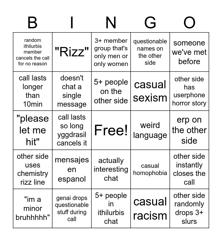 This bingo card has a free space and 24 words: "im a minor bruhhhhh", mensajes en espanol, 5+ people on the other side, casual racism, someone we've met before, random ithilurbis member cancels the call for no reason, "Rizz", 3+ member group that's only men or only women, weird language, erp on the other side, "please let me hit", doesn't chat a single message, casual homophobia, other side instantly closes the call, call lasts longer than 10min, genai drops questionable stuff during call, 5+ people in ithilurbis chat, questionable names on the other side, other side has userphone horror story, other side uses chemistry rizz line, call lasts so long yggdrasil cancels it, actually interesting chat, casual sexism and other side randomly drops 3+ slurs.