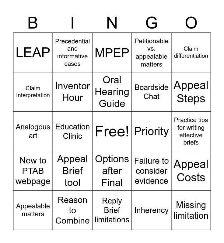 This bingo card has a free space and 24 words: Appeal Brief tool, Reason to Combine, Oral Hearing Guide, Appealable matters, Claim differentiation, LEAP, Claim Interpretation, Precedential and informative cases, Priority, Options after Final, Boardside Chat, Analogous art, Failure to consider evidence, Appeal Costs, Inventor Hour, Inherency, Practice tips for writing effective briefs, MPEP, Appeal Steps, Education Clinic, Missing limitation, New to PTAB webpage, Petitionable vs. appealable matters and Reply Brief limitations.