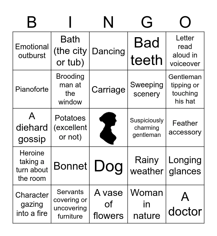This bingo card has a free space and 24 words: Bonnet, Servants covering or uncovering furniture, Carriage, Character gazing into a fire, Letter read aloud in voiceover, Emotional outburst, Pianoforte, Bath (the city or tub), Suspiciously charming gentleman, Dog, Sweeping scenery, A diehard gossip, Rainy weather, Longing glances, Brooding man at the window, Woman in nature, Feather accessory, Dancing, Gentleman tipping or touching his hat, Potatoes (excellent or not), A doctor, Heroine taking a turn about the room, Bad teeth and A vase of flowers.