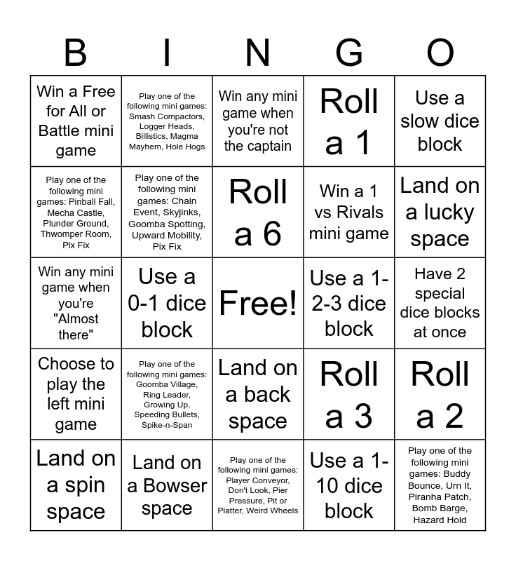 This bingo card has a free space and 48 words: Play one of the following mini games: Card Smarts, Pianta Pool, Flinger Painting, Peak Precision, Block and Roll, Play one of the following mini games: Buddy Bounce, Urn It, Piranha Patch, Bomb Barge, Hazard Hold, Play one of the following mini games: Ballistic Beach, Manor of Escape, Twist Ending, Bumper Bubbles, Line in the Sand, Play one of the following mini games: Player Conveyor, Don't Look, Pier Pressure, Pit or Platter, Weird Wheels, Play one of the following mini games: Goomba Village, Ring Leader, Growing Up, Speeding Bullets, Spike-n-Span, Play one of the following mini games: Launch Break, Polar Extreme, Toad and Go Seek, Fungi Frenzy, Tackle Takedown, Play one of the following mini games: Smash Compactors, Logger Heads, Billistics, Magma Mayhem, Hole Hogs, Play one of the following mini games: Goomba Bowling, 10 to Win, Jigsaw Jumble, Pizza Me Mario, Ruins Rumble, Play one of the following mini games: Pinball Fall, Mecha Castle, Plunder Ground, Thwomper Room, Pix Fix, Play one of the following mini games: Tumble Temple, Tuber Tug, Snow Go, Skipping Class, Mob Sleds, Play one of the following mini games: Chain Event, Skyjinks, Goomba Spotting, Upward Mobility, Pix Fix, Roll a 1, Roll a 2, Roll a 3, Roll a 4, Roll a 5, Roll a 6, Use a 1-2-3 dice block, Use a 4-5-6 dice block, Use a slow dice block, Use a 0-1 dice block, Use a 1-10 dice block, Win a Free for All or Battle mini game, Win a 1 vs Rivals mini game, Land on a dice block space, Land on a lucky space, Land on a spin space, Land on a shuffle space, Land on a back space, Choose to play the left mini game, Choose to play the right mini game, Choose to play the middle mini game, Have 50 mini stars, Don't get last place in a boss mini game, Land on a Bowser space, Run into mini stars on the board while being captain, Run into mini ztars on the board while being captain, Have 2 special dice blocks at once, Get 2nd place in a free-for-all or Battle mini game, Get 3rd place in a free-for-all or Battle mini game, Get 4th place in a free-for-all or Battle mini game, Win any mini game while being captain, Win any mini game when you're not the captain, Gain at least 10 mini stars at once, Win any mini game when you're "Almost there", Find mini stars from a dice block space, Find a mini game from a dice block space and Win any game while not being captain.