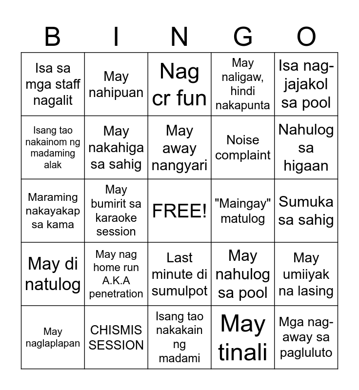 This bingo card has a free space and 24 words: May naglaplapan, May nag home run A.K.A penetration, May away nangyari, May tinali, Isa nag-jajakol sa pool, Isa sa mga staff nagalit, May nahipuan, Nag cr fun, "Maingay" matulog, Sumuka sa sahig, Maraming nakayakap sa kama, May nakahiga sa sahig, May nahulog sa pool, May umiiyak na lasing, Isang tao nakainom ng madaming alak, CHISMIS SESSION, Isang tao nakakain ng madami, May naligaw, hindi nakapunta, Nahulog sa higaan, May di natulog, May bumirit sa karaoke session, Last minute di sumulpot, Noise complaint and Mga nag-away sa pagluluto.