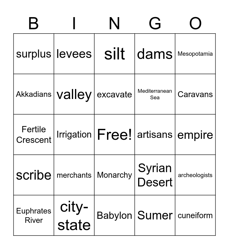 This bingo card has a free space and 29 words: Euphrates River, Tigris River, Irrigation, Hammurabi's Code, surplus, silt, valley, merchants, artisans, city-state, empire, cuneiform, Babylon, Sumer, Caravans, Province, Monarchy, scribe, Mesopotamia, Fertile Crescent, Syrian Desert, Persian Gulf, Mediterranean Sea, Akkadians, dams, levees, archeologists, excavate and Iran.