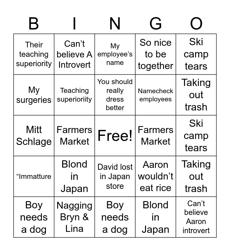 This bingo card has a free space and 34 words: Mitt Schlage, Blond in Japan, Aaron Picky eater, David difficult toddler, “Immatture, Teaching superioriity, Ski camp tears, Boy needs a dog, Can’t believe A Introvert, So nice to be together, You should really dress better, My employee’s name, My surgeries, Doctors’s Spanish name, Farmers Market, Taking out trash, Nagging Bryn & Lina, Mitt Schlage, Blond in Japan, Aaron wouldn’t eat rice, David lost in Japan store, Immatture, Their teaching superiority, Ski camp tears, Boy needs a dog, Can’t believe Aaron introvert, So nice to be together, You really should dress better, Namecheck employees, My surgeries, My doctor has Spanish name, Farmers Market, Taking out trash and Nagging Bryn and Lina.