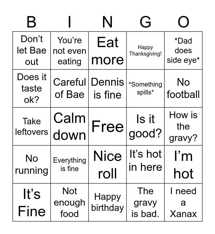 This bingo card has a free space and 24 words: It’s Fine, Everything is fine, Dennis is fine, The gravy is bad., *Dad does side eye*, Don’t let Bae out, You’re not even eating, Eat more, Is it good?, How is the gravy?, Take leftovers, Careful of Bae, It’s hot in here, I’m hot, Does it taste ok?, Not enough food, Happy birthday, Happy Thanksgiving!, No football, No running, Calm down, Nice roll, *Something spills* and I need a Xanax.