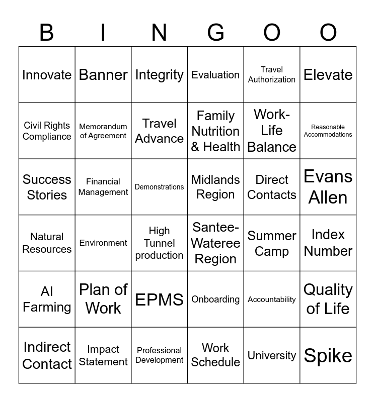 This bingo card has 81 words: Free!, Ag and Land Grant, Integrity, Teamwork, Extension Creed, Climate-Smart, University, Public Service, Work Schedule, Planning Stage, EPMS, Contact Hours, Evaluation, Innovate, Educate, Elevate, Quality of Life, Direct Contacts, Workshops, Demonstrations, Professional Development, Travel Authorization, Work-Life Balance, Memorandum of Agreement, Civil Rights Compliance, Farmers' Market, Advisory Council, Volunteers, Youth Day, Program Delivery, Family Nutrition & Health, Diet Quality, Summer Camp, AI Farming, High Tunnel production, Financial Management, EIS, 4-H, Indirect Contact, Impact Statement, Success Stories, Plan of Work, Civil Rights Review, Non-Discrimination Statement, Reasonable Accommodations, P-Card Request, Banner, Onboarding, DocuSign, Sustainable Ag., Natural Resources, Environment, Youth Day, Bulldog Bucks, Card one, Community Economic Development, Marching 101, Spike, Go Dogs, Research, Evans Allen, Cover Crop, Mixon Seeds, Growing Palmetto, Elevate Leadership, National Youth Science Day, 4-H Ignite, Ag. Scholar, Camp Daniels, Low Country Region, Upstate Region, Midlands Region, Santee-Wateree Region, Pee Dee Region, Freewoods Farm, Accountability, Justification, Index Number, Account Code, Travel Advance and Essential Travel Authorization.