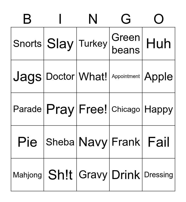 This bingo card has a free space and 24 words: Sheba, Sh!t, What!, Mahjong, Huh, Snorts, Jags, Slay, Chicago, Navy, Appointment, Parade, Frank, Fail, Doctor, Drink, Happy, Turkey, Apple, Pray, Dressing, Pie, Green beans and Gravy.