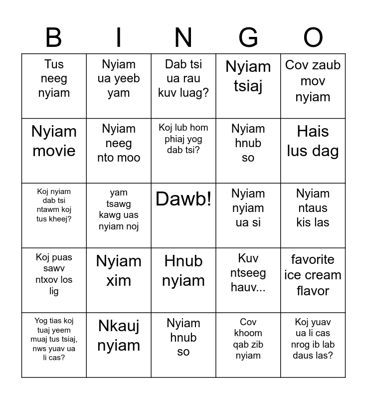 This bingo card has a free space and 24 words: Nyiam xim, Nkauj nyiam, Koj lub hom phiaj yog dab tsi?, Yog tias koj tuaj yeem muaj tus tsiaj, nws yuav ua li cas?, Cov zaub mov nyiam, Tus neeg nyiam, Nyiam movie, Nyiam ua yeeb yam, Nyiam nyiam ua si, Hnub nyiam, Nyiam hnub so, Koj nyiam dab tsi ntawm koj tus kheej?, Kuv ntseeg hauv..., favorite ice cream flavor, Nyiam neeg nto moo, Cov khoom qab zib nyiam, Nyiam ntaus kis las, Dab tsi ua rau kuv luag?, Hais lus dag, yam tsawg kawg uas nyiam noj, Koj yuav ua li cas nrog ib lab daus las?, Koj puas sawv ntxov los lig, Nyiam tsiaj and Nyiam hnub so.