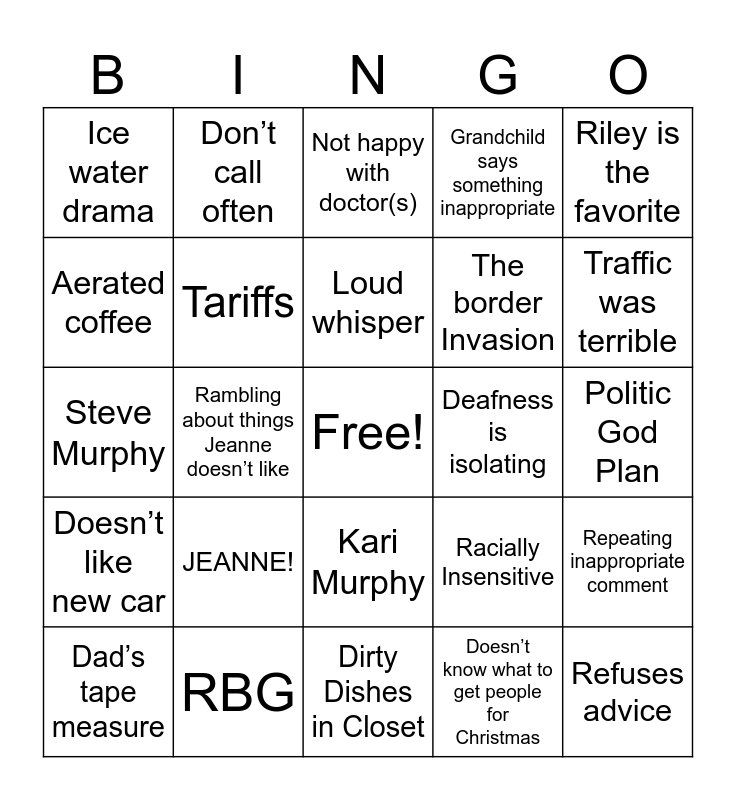 This bingo card has a free space and 25 words: JEANNE!, Dirty Dishes in Closet, Loud whisper, Dad’s tape measure, Riley is the favorite, Ice water drama, Aerated coffee, Don’t call often, Deafness is isolating, Kari Murphy, The border Invasion, Steve Murphy, Racially Insensitive, Repeating inappropriate comment, Tariffs, Trump’s appointees, Politic God Plan, Not happy with doctor(s), Traffic was terrible, Rambling about things Jeanne doesn’t like, Refuses advice, RBG, Doesn’t like new car, Grandchild says something inappropriate and Doesn’t know what to get people for Christmas.
