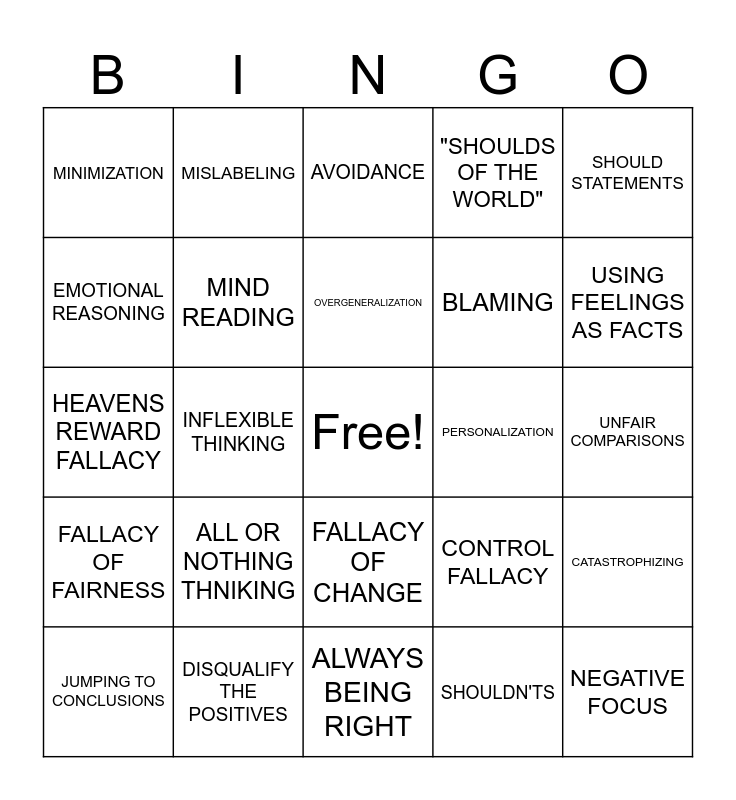 This bingo card has a free space and 24 words: ALL OR NOTHING THNIKING, DISQUALIFY THE POSITIVES, OVERGENERALIZATION, JUMPING TO CONCLUSIONS, SHOULD STATEMENTS, MINIMIZATION, EMOTIONAL REASONING, MISLABELING, PERSONALIZATION, FALLACY OF CHANGE, BLAMING, HEAVENS REWARD FALLACY, CONTROL FALLACY, CATASTROPHIZING, MIND READING, SHOULDN'TS, UNFAIR COMPARISONS, AVOIDANCE, USING FEELINGS AS FACTS, INFLEXIBLE THINKING, NEGATIVE FOCUS, FALLACY OF FAIRNESS, "SHOULDS OF THE WORLD" and ALWAYS BEING RIGHT.