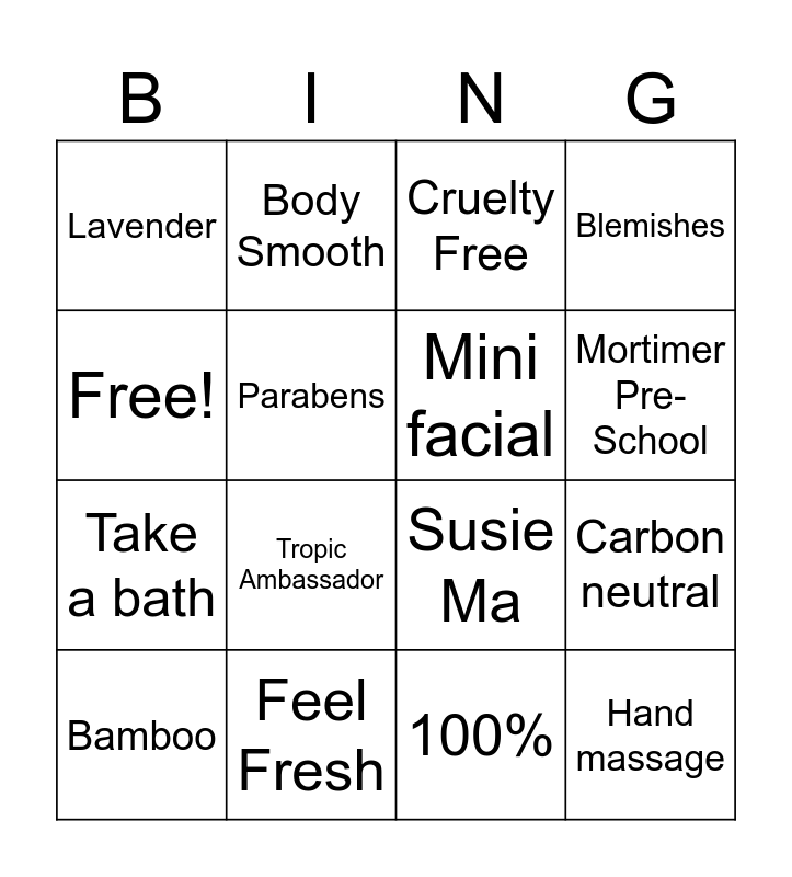 This bingo card has 16 words: Feel Fresh, Carbon neutral, Cruelty Free, Lavender, Take a bath, Body Smooth, Susie Ma, 100%, Free!, Parabens, Bamboo, Blemishes, Tropic Ambassador, Mortimer Pre-School, Mini facial and Hand massage.