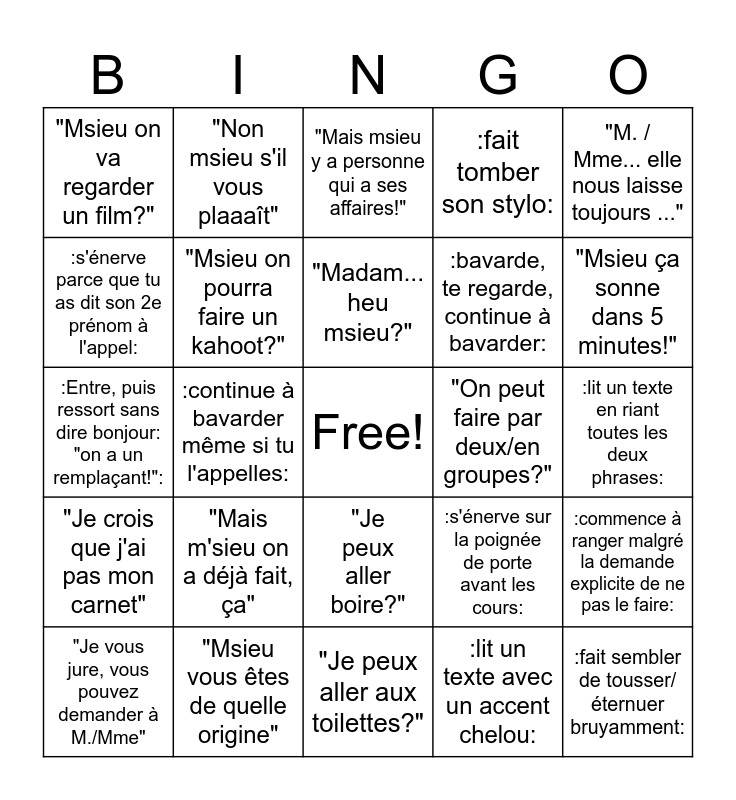 This bingo card has a free space and 24 words: "Mais m'sieu on a déjà fait, ça", "Msieu vous êtes de quelle origine", "Madam... heu msieu?", "Je vous jure, vous pouvez demander à M./Mme", "M. / Mme... elle nous laisse toujours ...", "Msieu on va regarder un film?", :s'énerve parce que tu as dit son 2e prénom à l'appel:, "Non msieu s'il vous plaaaît", "On peut faire par deux/en groupes?", "Je peux aller boire?", :bavarde, te regarde, continue à bavarder:, :Entre, puis ressort sans dire bonjour: "on a un remplaçant!":, :s'énerve sur la poignée de porte avant les cours:, :commence à ranger malgré la demande explicite de ne pas le faire:, "Msieu on pourra faire un kahoot?", :lit un texte avec un accent chelou:, :lit un texte en riant toutes les deux phrases:, "Mais msieu y a personne qui a ses affaires!", "Msieu ça sonne dans 5 minutes!", :continue à bavarder même si tu l'appelles:, :fait sembler de tousser/éternuer bruyamment:, "Je crois que j'ai pas mon carnet", :fait tomber son stylo: and "Je peux aller aux toilettes?".