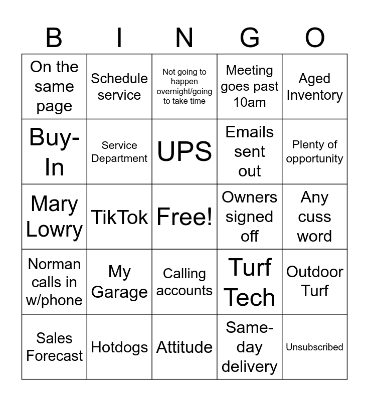This bingo card has a free space and 24 words: My Garage, Hotdogs, UPS, Sales Forecast, Aged Inventory, On the same page, Buy-In, Schedule service, Owners signed off, Calling accounts, Emails sent out, Mary Lowry, Turf Tech, Outdoor Turf, Service Department, Same-day delivery, Any cuss word, Not going to happen overnight/going to take time, Plenty of opportunity, TikTok, Unsubscribed, Norman calls in w/phone, Meeting goes past 10am and Attitude.