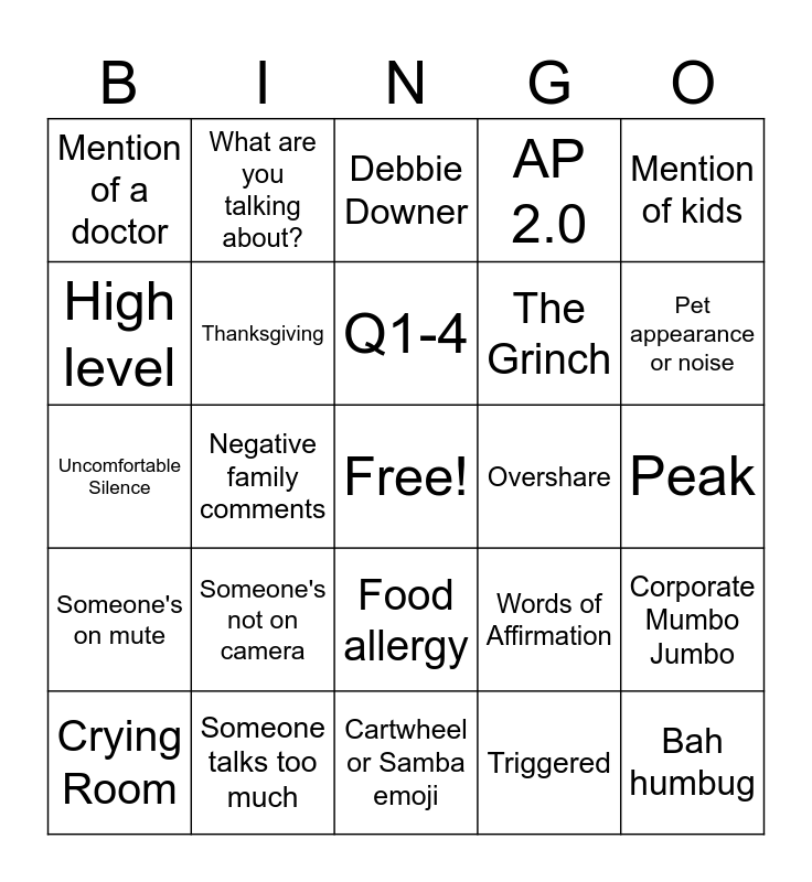 This bingo card has a free space and 29 words: Crying Room, Someone is sarcastic, Negative family comments, Christmas, Mention of a doctor, Debbie Downer, Thanksgiving, Someone's not on camera, Overshare, Someone talks too much, Peak, Bah humbug, Cartwheel or Samba emoji, Triggered, Pet appearance or noise, Therapist, Food allergy, Someone's on mute, Mention of kids, Uncomfortable Silence, Words of Affirmation, Someone looks emotional, The Grinch, High level, AP 2.0, What are you talking about?, Corporate Mumbo Jumbo, Q1-4 and New change.