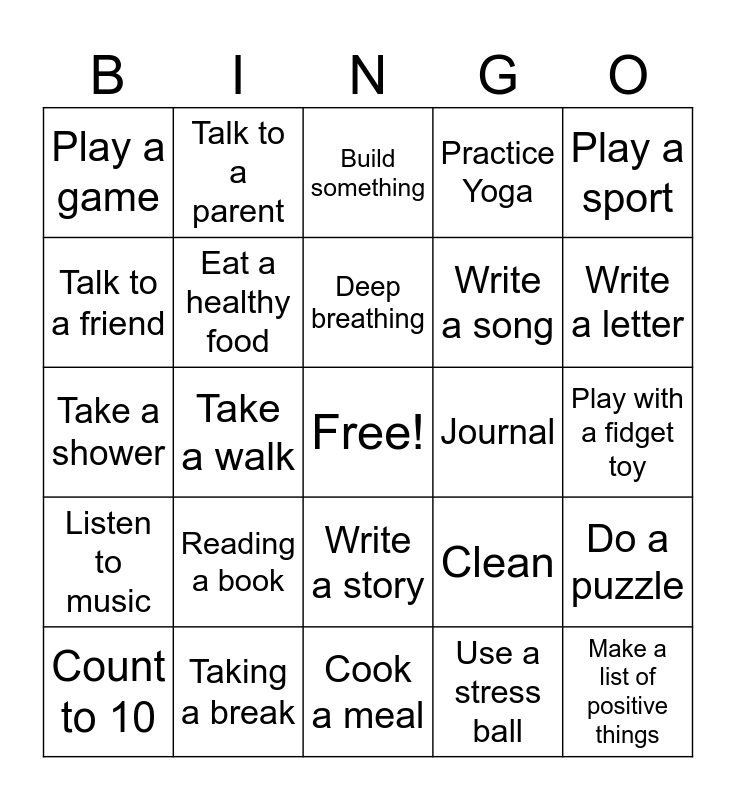 This bingo card has a free space and 24 words: Reading a book, Taking a break, Deep breathing, Count to 10, Play a sport, Play a game, Talk to a friend, Talk to a parent, Journal, Write a story, Write a song, Take a shower, Clean, Do a puzzle, Eat a healthy food, Use a stress ball, Play with a fidget toy, Build something, Write a letter, Take a walk, Make a list of positive things, Listen to music, Practice Yoga and Cook a meal.
