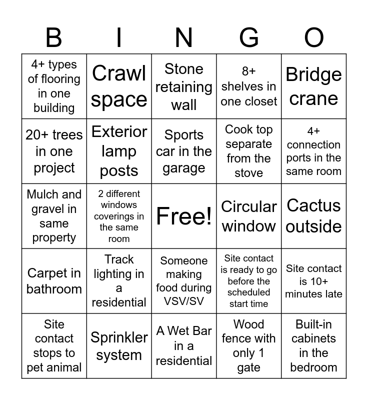 This bingo card has a free space and 25 words: Track lighting in a residential, A Wet Bar in a residential, Sports car in the garage, Site contact stops to pet animal, Bridge crane, 4+ types of flooring in one building, 20+ trees in one project, Crawl space, Circular window, Someone making food during VSV/SV, Cook top separate from the stove, Mulch and gravel in same property, Site contact is ready to go before the scheduled start time, Site contact is 10+ minutes late, Exterior lamp posts, Snow on ground, Cactus outside, Stone retaining wall, 4+ connection ports in the same room, 2 different windows coverings in the same room, Built-in cabinets in the bedroom, Sprinkler system, Carpet in bathroom, 8+ shelves in one closet and Wood fence with only 1 gate.