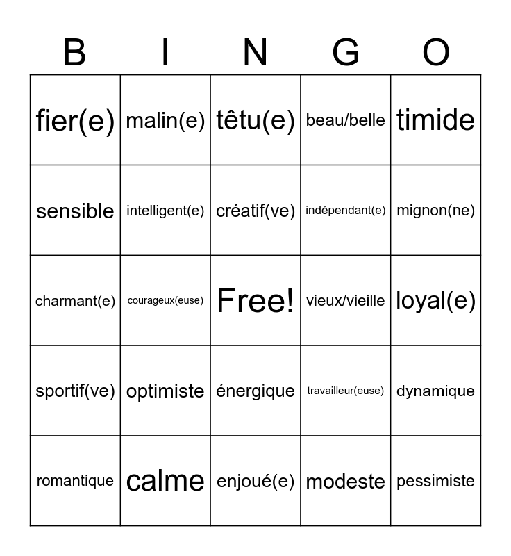 This bingo card has a free space and 36 words: gentil(le), sympathique, drôle, intelligent(e), travailleur(euse), sportif(ve), créatif(ve), patient(e), timide, généreux(euse), courageux(euse), beau/belle, jeune, vieux/vieille, mignon(ne), fier(e), sérieux(euse), optimiste, pessimiste, têtu(e), loyal(e), dynamique, calme, romantique, enjoué(e), malin(e), charmant(e), câlin(e), indépendant(e), sensible, réaliste, fou/folle, modeste, énergique, impatient(e) and honnête.