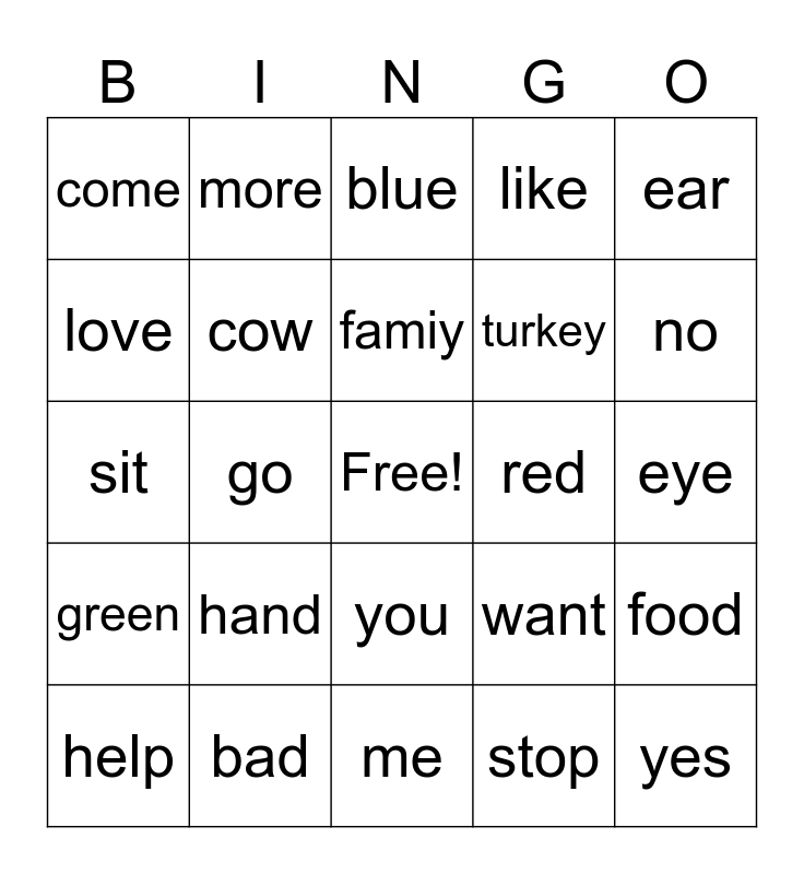 This bingo card has a free space and 30 words: bad, good, go, pig, come, blue, cow, you, red, me, eye, yes, stop, leg, no, name, want, green, hand, ear, sit, not, more, turkey, love, like, food, help, famiy and drink.