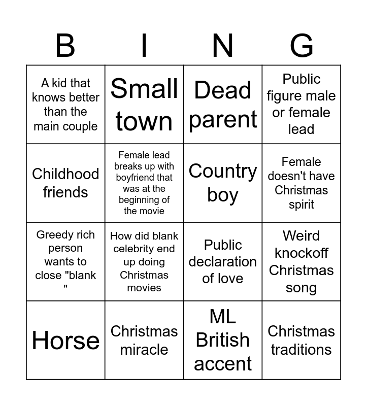 This bingo card has 31 words: Disapproving parent of relationship, Enemy to lovers, Weird knockoff Christmas song, Santa, A kid that knows better than the main couple, Dead parent, Country boy, City girl, Christmas miracle, Come running to each other at the end, ML British accent, Horse, Dog, Misunderstanding, How did blank celebrity end up doing Christmas movies, Career path change, Heading home for Christmas, Snow's on Christmas, Christmas traditions, Christmas competition, Childhood friends, First Love, "Christmas is more than presents", Small town, Greedy rich person wants to close "blank ", Female lead breaks up with boyfriend that was at the beginning of the movie, Public figure male or female lead, Public declaration of love, Someone says "Christmas spirit", Female doesn't have Christmas spirit and Divorced woman.