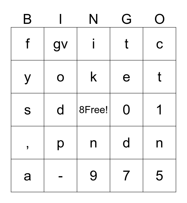 This bingo card has a free space and 29 words: a, s, d, f, f, i, o, p, 0, -, 1, 5, 9, 7, t, v, n, ,, c, s, d, g, e, y, t, gv, n, k and ik.