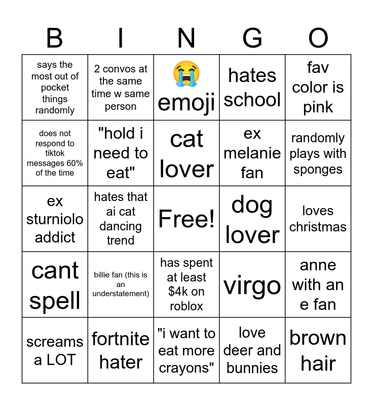 This bingo card has a free space and 24 words: billie fan (this is an understatement), fortnite hater, cat lover, screams a LOT, fav color is pink, says the most out of pocket things randomly, does not respond to tiktok messages 60% of the time, 2 convos at the same time w same person, dog lover, has spent at least $4k on roblox, ex melanie fan, ex sturniolo addict, virgo, anne with an e fan, "hold i need to eat", love deer and bunnies, loves christmas, 😭 emoji, randomly plays with sponges, hates that ai cat dancing trend, brown hair, cant spell, hates school and "i want to eat more crayons".
