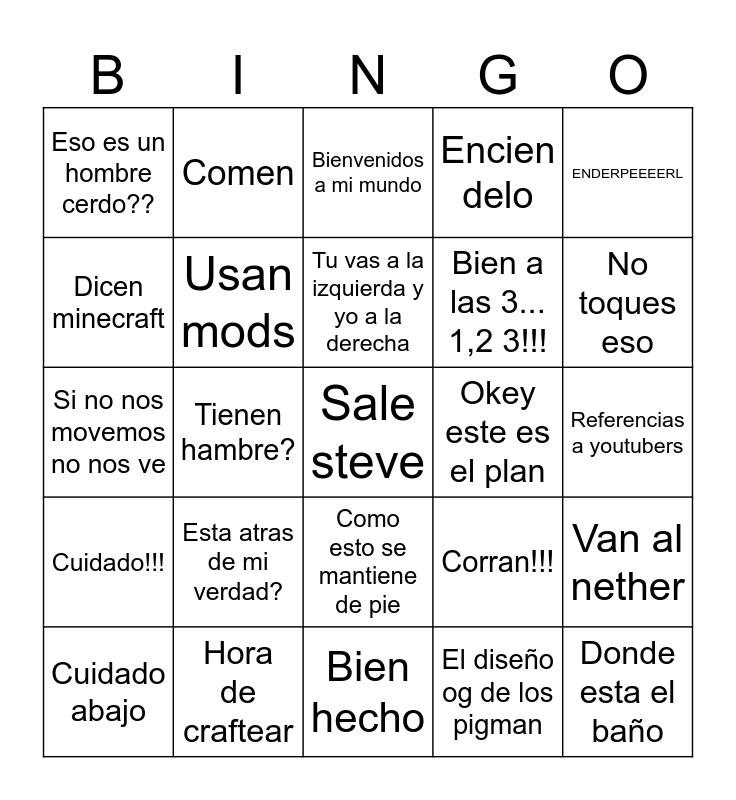 This bingo card has a free space and 24 words: Esta atras de mi verdad?, Hora de craftear, Tu vas a la izquierda y yo a la derecha, Cuidado abajo, ENDERPEEEERL, Eso es un hombre cerdo??, Dicen minecraft, Comen, Okey este es el plan, Como esto se mantiene de pie, Bien a las 3... 1,2 3!!!, Si no nos movemos no nos ve, Corran!!!, Van al nether, Usan mods, El diseño og de los pigman, Referencias a youtubers, Bienvenidos a mi mundo, No toques eso, Tienen hambre?, Donde esta el baño, Cuidado!!!, Encien delo and Bien hecho.
