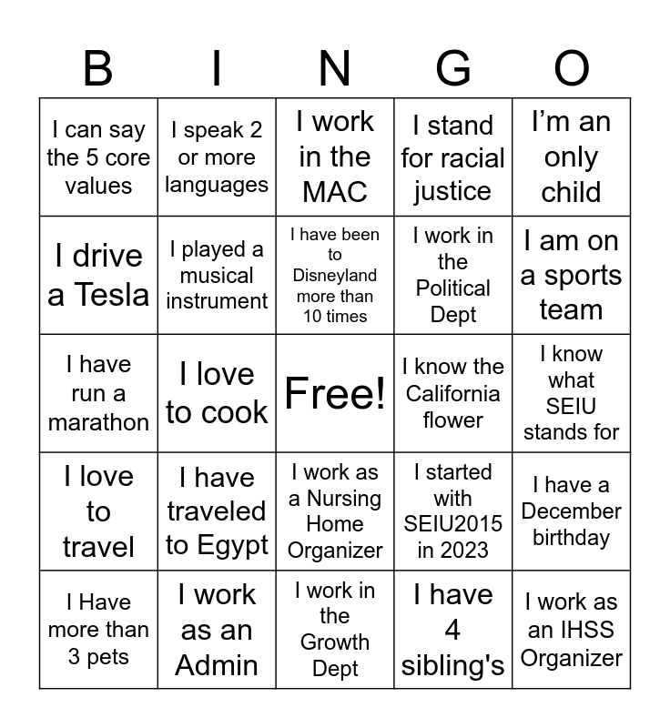 This bingo card has a free space and 24 words: I have traveled to Egypt, I work as an Admin, I have been to Disneyland more than 10 times, I Have more than 3 pets, I’m an only child, I can say the 5 core values, I drive a Tesla, I speak 2 or more languages, I know the California flower, I work as a Nursing Home Organizer, I work in the Political Dept, I have run a marathon, I started with SEIU2015 in 2023, I have a December birthday, I played a musical instrument, I have 4 sibling's, I know what SEIU stands for, I work in the MAC, I am on a sports team, I love to cook, I work as an IHSS Organizer, I love to travel, I stand for racial justice and I work in the Growth Dept.