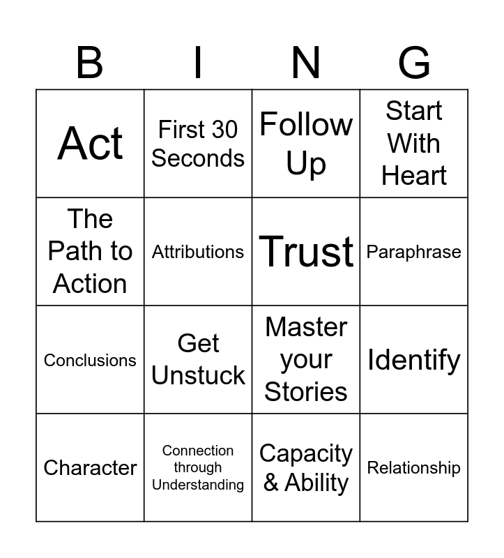 This bingo card has 29 words: A coach, XP Coaching, Identify, Plan, Act, Follow Up, Trust, Connection, Connection through Understanding, Intent & Motive, Capacity & Ability, Character, Track Record, Crucial Conversation, Get Unstuck, Content, Pattern, Relationship, The Path to Action, Master your Stories, A Fact, Judgements, Conclusions, Attributions, Start With Heart, First 30 Seconds, How to Make it Safe, Paraphrase and Move to Action.