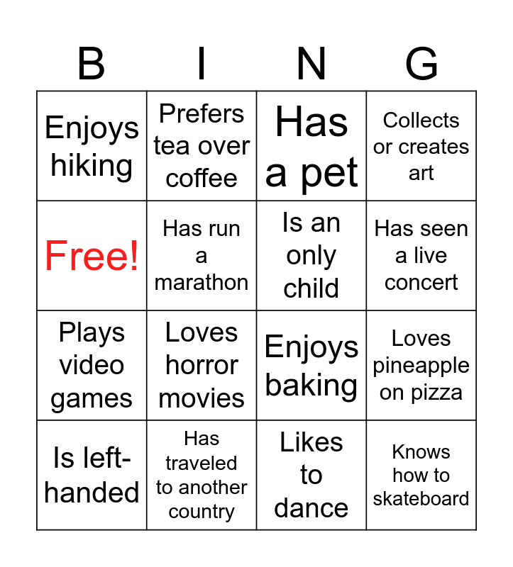 This bingo card has 16 words: Has traveled to another country, Loves pineapple on pizza, Has a pet, Enjoys hiking, Plays video games, Prefers tea over coffee, Enjoys baking, Likes to dance, Free!, Has run a marathon, Is left-handed, Collects or creates art, Loves horror movies, Has seen a live concert, Is an only child and Knows how to skateboard.