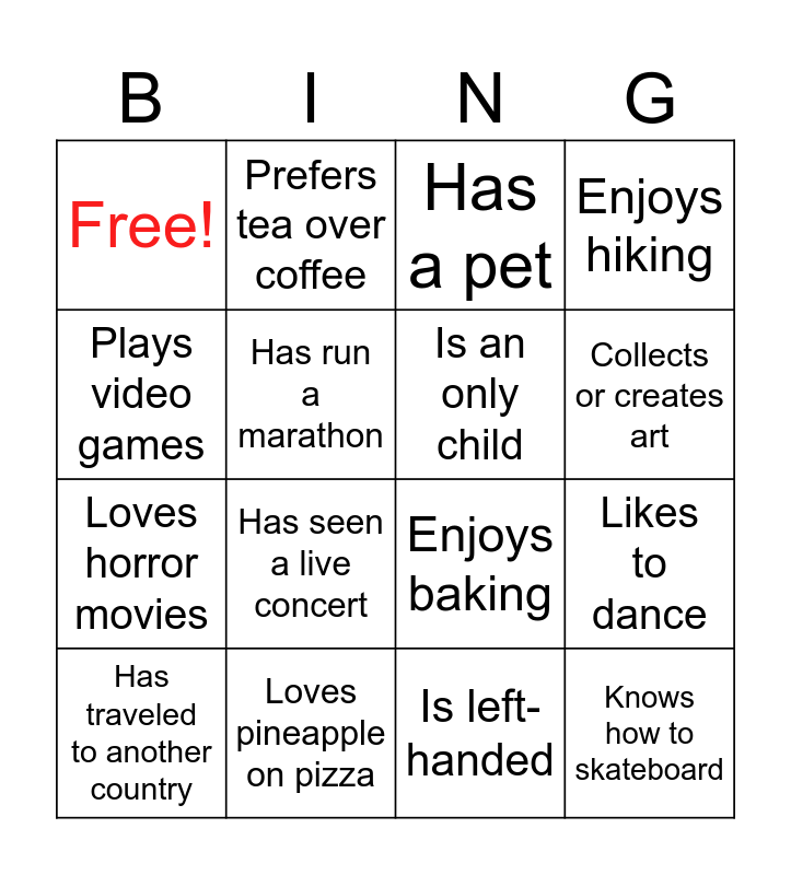 This bingo card has 16 words: Has traveled to another country, Loves pineapple on pizza, Has a pet, Enjoys hiking, Plays video games, Prefers tea over coffee, Enjoys baking, Likes to dance, Free!, Has run a marathon, Is left-handed, Collects or creates art, Loves horror movies, Has seen a live concert, Is an only child and Knows how to skateboard.