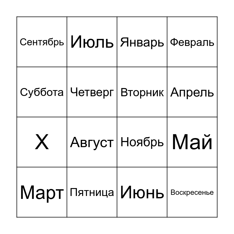 This bingo card has 20 words: Март, Октябрь, Январь, Май, Декабрь, Август, Июнь, Февраль, X, Июль, Ноябрь, Апрель, Сентябрь, Пятница, Вторник, X, Суббота, Четверг, Среда and Воскресенье.