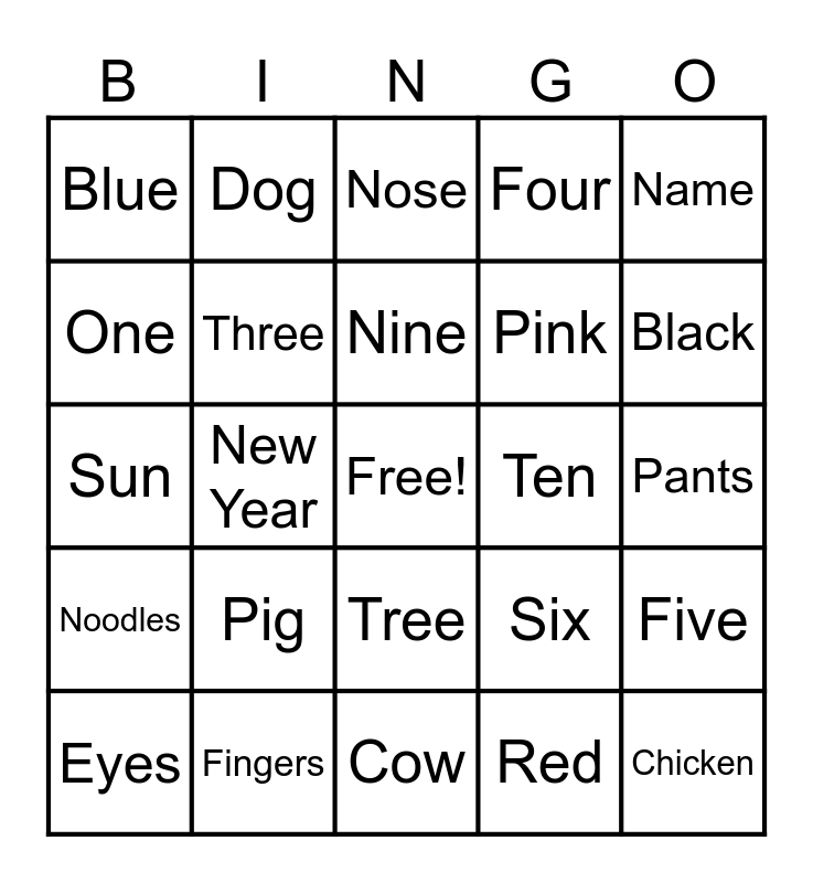 This bingo card has a free space and 51 words: Rice, Chicken, Shrimp, Cow, Pig, Cat, Dog, Water, One, Two, Three, Four, Five, Six, Seven, Eight, Nine, Ten, Twenty, Name, New Year, Red, Blue, Pink, Yellow, White, Black, Head, Eyes, Nose, Teeth, Cheek, Eyebrows, Hair, Hands, Fingers, Smile, Laugh, Cry, Shirt, Pants, Noodles, Mom, Dad, Grandma, Grandpa, Sun, Moon, Mountain, Tree and Flower.