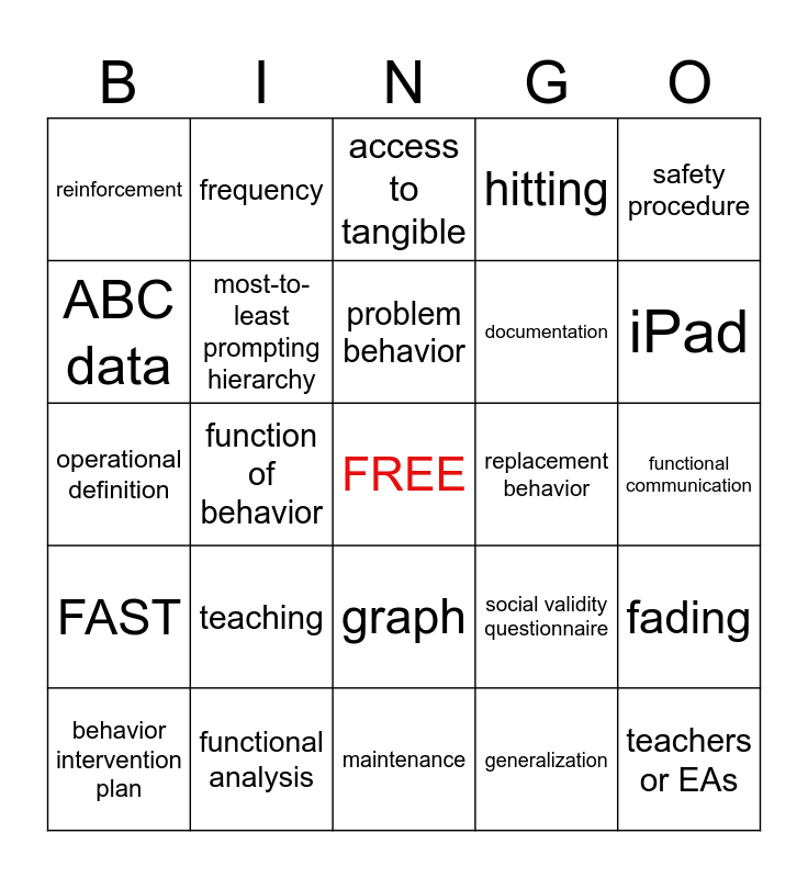 This bingo card has a free space and 24 words: teaching, functional analysis, problem behavior, behavior intervention plan, safety procedure, reinforcement, ABC data, frequency, replacement behavior, graph, documentation, operational definition, social validity questionnaire, fading, most-to-least prompting hierarchy, generalization, functional communication, access to tangible, iPad, function of behavior, teachers or EAs, FAST, hitting and maintenance.