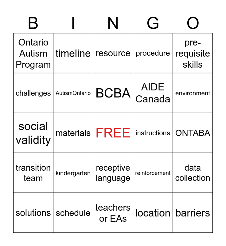This bingo card has a free space and 24 words: kindergarten, schedule, BCBA, solutions, pre-requisite skills, Ontario Autism Program, challenges, timeline, instructions, receptive language, AIDE Canada, social validity, reinforcement, data collection, AutismOntario, location, ONTABA, resource, environment, materials, barriers, transition team, procedure and teachers or EAs.