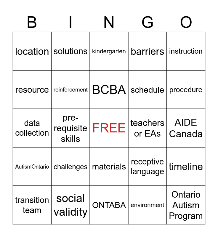 This bingo card has a free space and 24 words: challenges, social validity, BCBA, transition team, instruction, location, resource, solutions, teachers or EAs, materials, schedule, data collection, receptive language, timeline, reinforcement, environment, AIDE Canada, kindergarten, procedure, pre-requisite skills, Ontario Autism Program, AutismOntario, barriers and ONTABA.