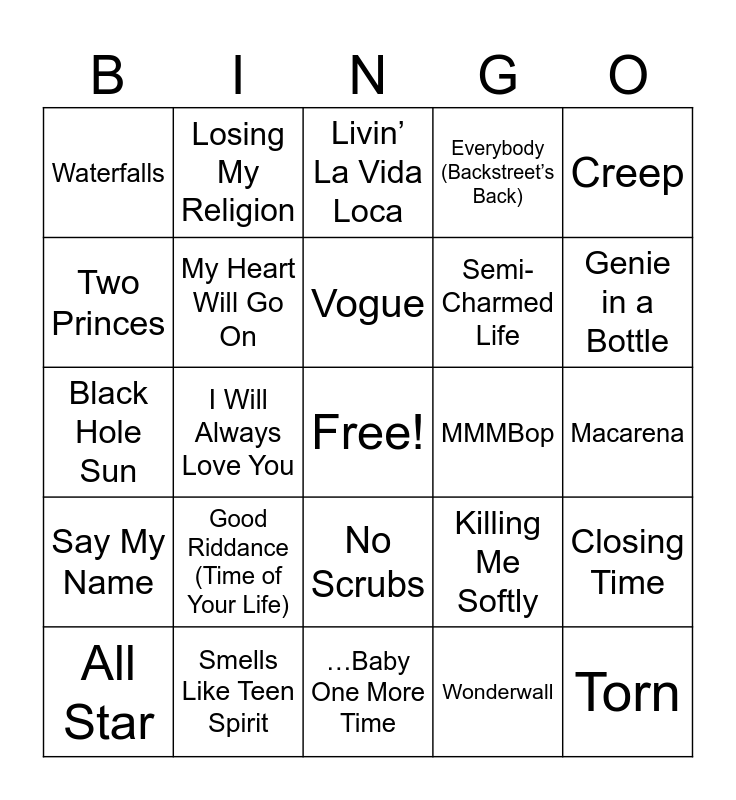 This bingo card has a free space and 30 words: Smells Like Teen Spirit, Wannabe, I Will Always Love You, Baby Got Back, Waterfalls, Livin’ La Vida Loca, My Heart Will Go On, No Scrubs, MMMBop, …Baby One More Time, Macarena, Torn, Wonderwall, Basket Case, Genie in a Bottle, Ironic, Killing Me Softly, Say My Name, Good Riddance (Time of Your Life), Creep, Black Hole Sun, Zombie, Losing My Religion, Semi-Charmed Life, Two Princes, Everybody (Backstreet’s Back), Closing Time, All Star, Vogue and Ice Ice Baby.